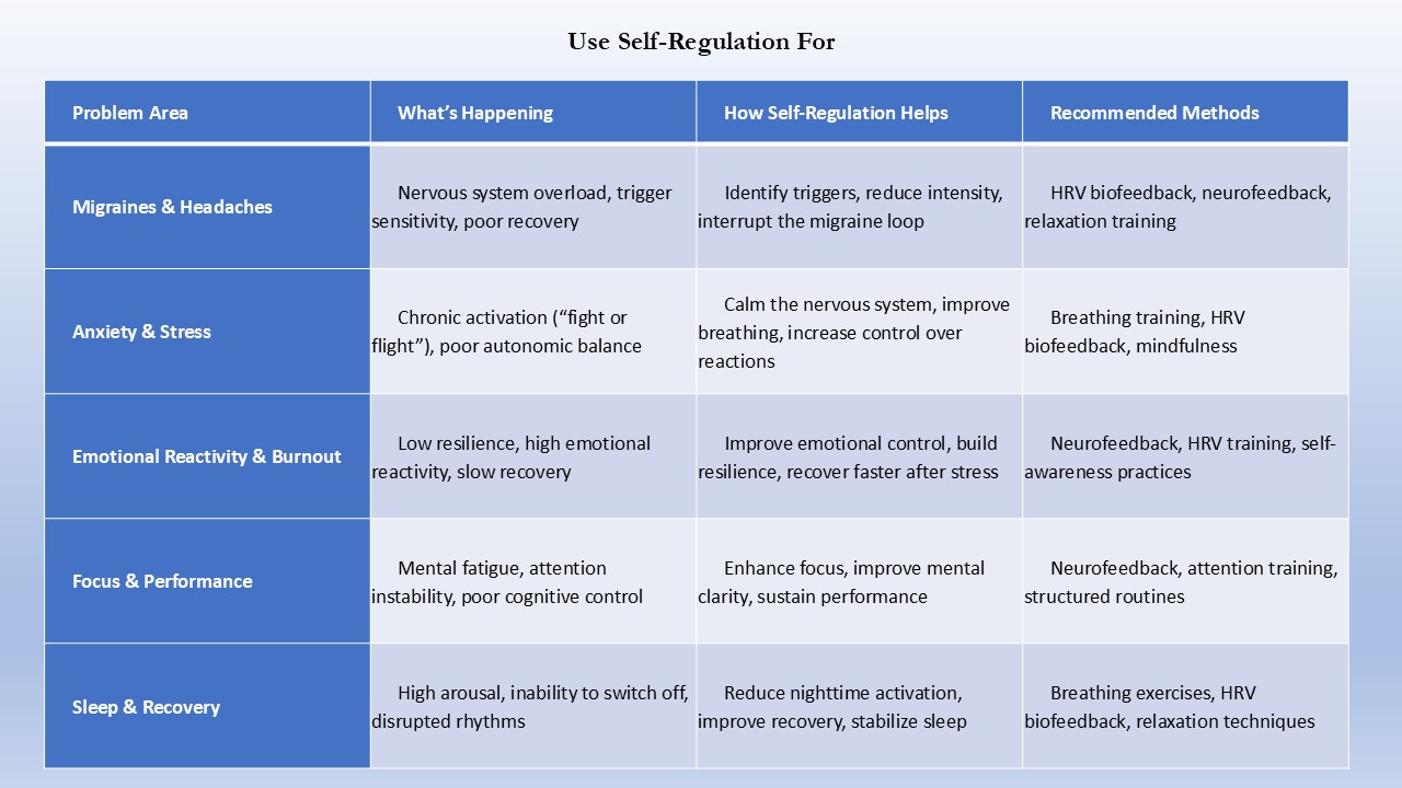 Without self-regulation, the body can remain stuck in chronic stress patterns, which may lead to anxiety, migraines, fatigue, and emotional instability. With proper training, however, you can restore balance and improve performance, focus, and well-being.
